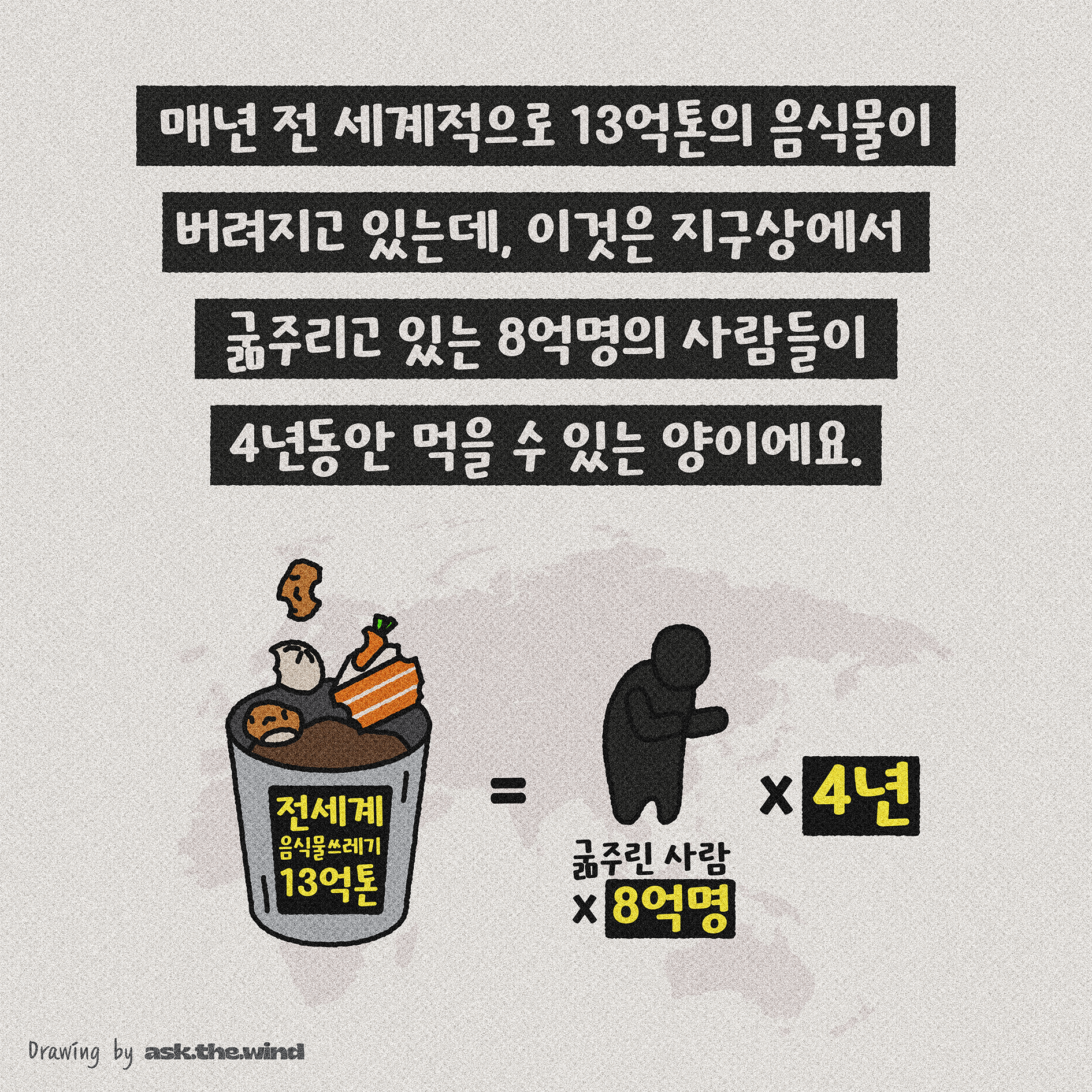 매년 전세계적으로 13억톤의 음식물이 버려지고 있어요.