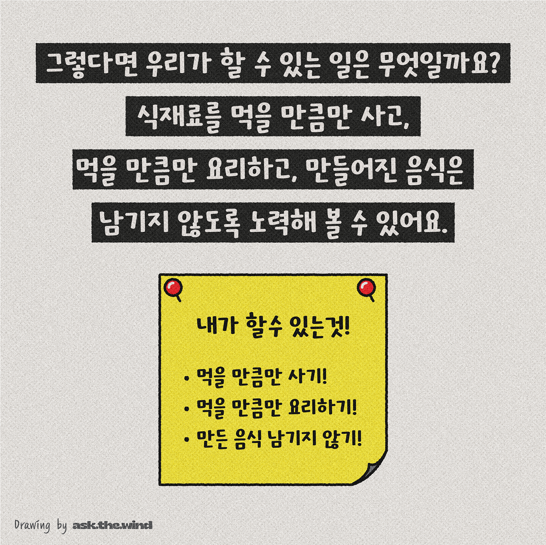 우리가 할 수 있는 일은 먹을 만큼만 요리하고 만들어진 음식은 남기지 않는거에요.