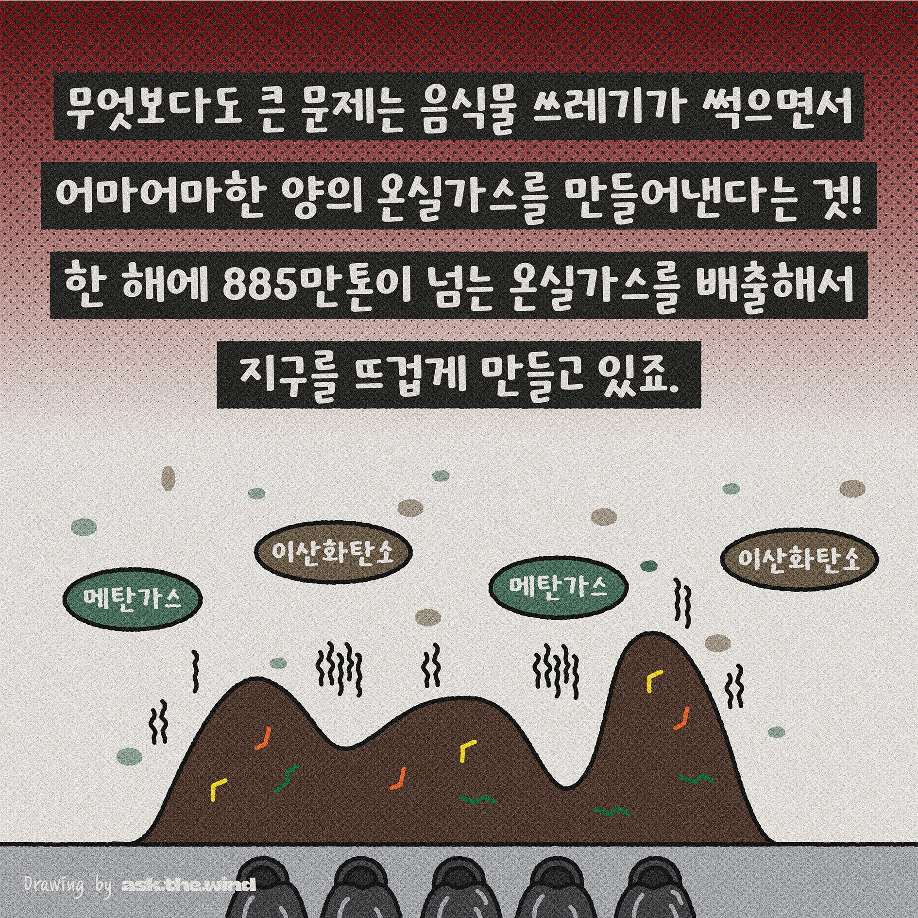 음식물 쓰레기가 썩으면서 온실가스를 배출해서 지구를 뜨겁게 만들어요.