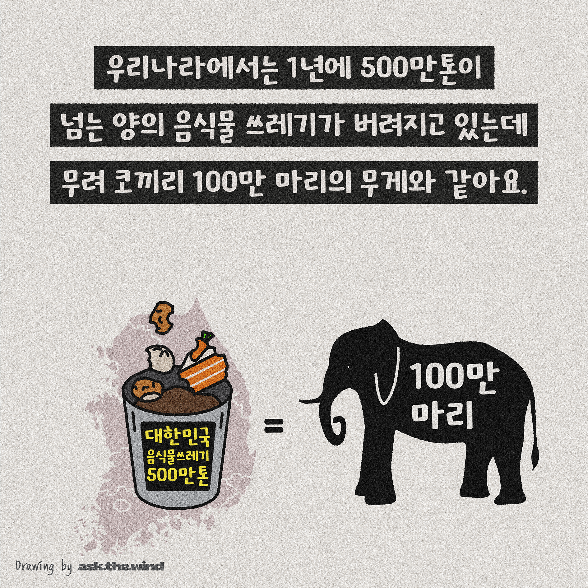 우리나라에서는 1년에 500만톤이 넘는 양의 음식물 쓰레기가 버려지고 있는데 코끼리 100만마리의 무게와 같아요.