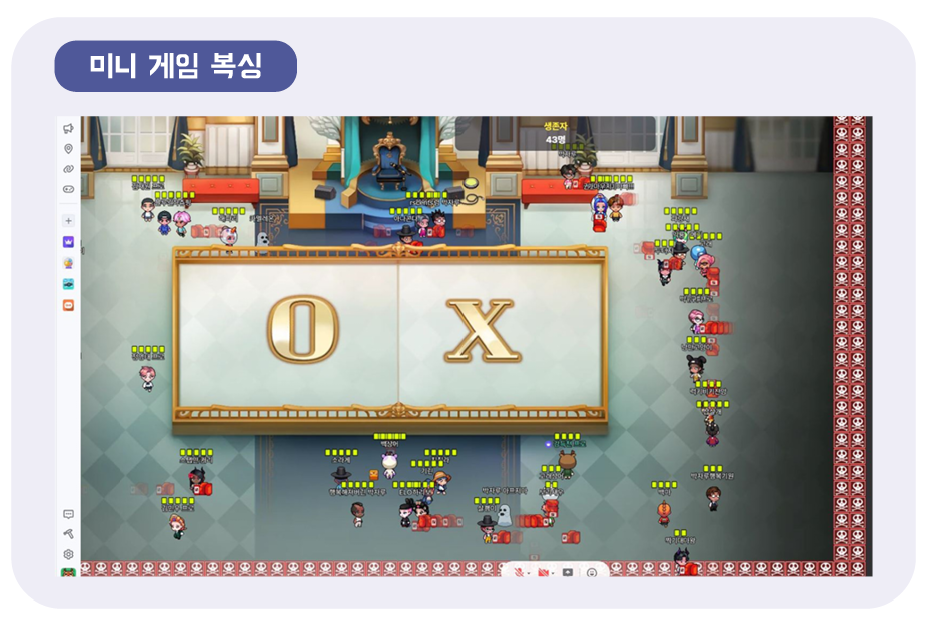 이번 행사는 직원들이 각자 모바일 또는 PC를 통해 익명 캐릭터로 메타버스 퀴즈 게임장에 접속하는 방식으로 진행되었습니다. 총 3개 조로 편성된 직원들은 회사의 비전과 미션, 그리고 시사 상식(문화, 역사, 스포츠 등)을 주제로 한 총 12문제를 풀었습니다.