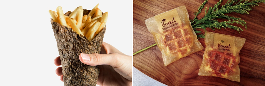 첫 번째로 이탈리아의 감자껍질로 만든 감자튀김 포장재 ‘필 세이버(peel saver)’, 두 번째로 ‘에보웨어(Evoware)’의 해초를 재료로 한 빵과 과자 포장재, 세 번째로는 미국 농무부에서 만든 우유 단백질 ‘카제인’에 펙틴을 섞어 만든 투명 식품 포장재, 그리고 마지막 네 번째로는 벨기에 ‘두 잇(Do Eat)’에서 물과 감자 전분으로 만든 식용 포장 용기 등이 있습니다.