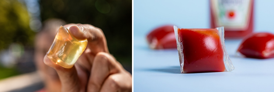 또한 영국의 배달 전문 업체인 ‘저스트잇(Just eat)’은 갈조류로 만든 생분해 필름 포장재를 휴대용 케첩 포장에 적용했는데요. ‘오호(Ooho)’라 불리는 이 케첩 포장재는 먹어도 될 뿐만 아니라 매립 시 생분해되고, 퇴비로도 활용 가능합니다.