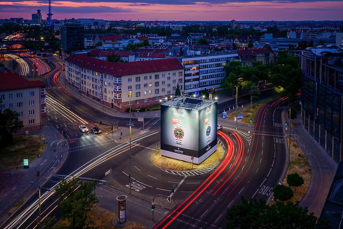 옥외광고 전문 회사 블로우업 미디어는 최근 태양광 발전 시스템을 이용해 거대한 자이언트 포스터 옥외광고를 도입했는데요. 600 제곱미터 크기의 큐브형 자이언트 포스터 ‘더 큐브’는 저녁 시간에 태양광 에너지로만 작동하는 LED 스포트라이트로 360° 전방위적인 광고뷰를 제공합니다.