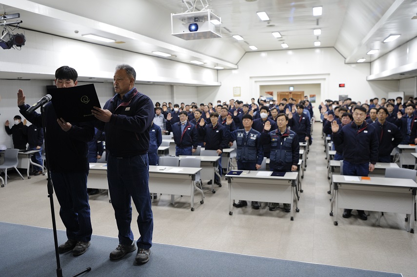 다음으로 근로자 대표가 안전 목표 및 방침을 낭독하고, 전 임직원이 힘차게 안전 구호를 외쳤습니다. 올해 근로자 대표로는 경험과 지혜를 가진 베테랑 선배 사원과 앞으로의 미래를 책임질 신입사원이 함께 참여하였으며, 이는 세대를 넘어 우리 모두가 '안전'이라는 하나의 목표를 향해 함께 나아가고 있다는 의미를 담았습니다.