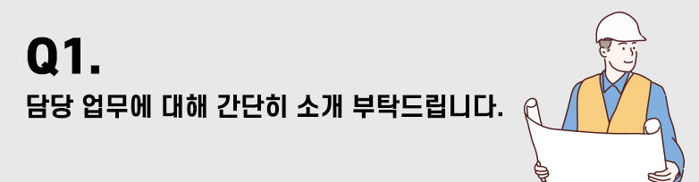 공정에 문제 발생 시 현장, 서류 등을 검토하여 보고서를 작성하여 원인 파악, 재발방지대책을 강구합니다. 또한 환경, 안전 쪽 월별, 분기별 작성해야 할 체크리스트를 누락되지 않도록 관리합니다.