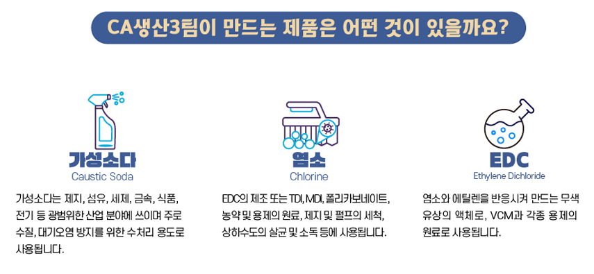 Project를 통해 건설된 CA/EDC 공정을 운영하고 있으며, 주요 제품은 염소, 가성소다, EDC 입니다.