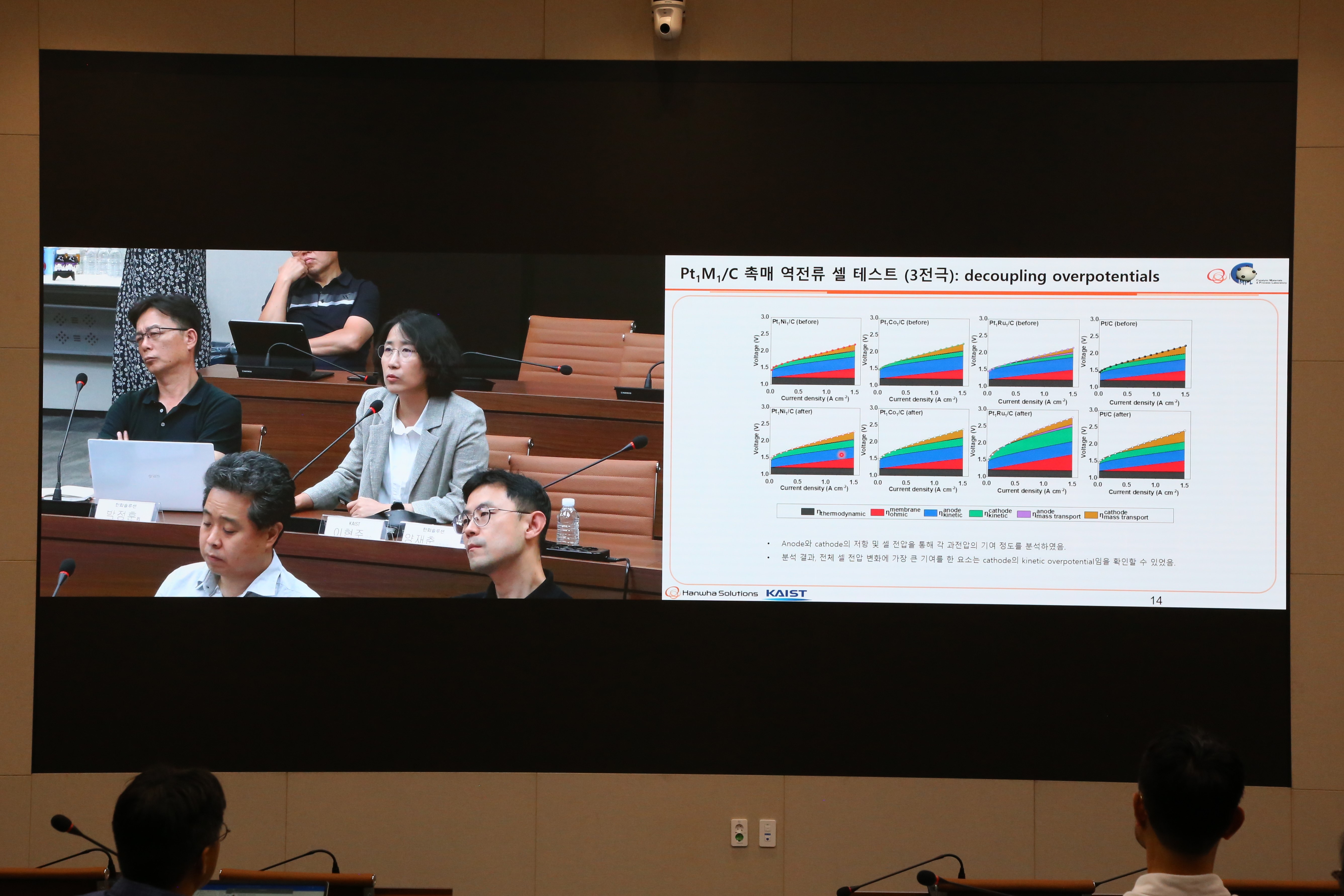 발표 세션에서는 이현주 교수가 수소발생반응(HER)용 촉매 개발의 최신 연구 현황을 소개하며, 수전해 과제와의 시너지 창출 방안을 모색했습니다. 이어 임성갑 교수는 탄소 재료 표면처리 기술 개발 현황을 발표하고, 관련 기술의 확장 가능성에 대해 논의했습니다.