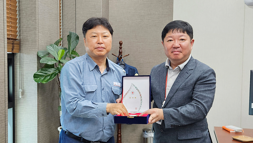 25년도 상반기 헌혈행사는 대한적십자사 광주전남혈액원에서 혈액수급 안정에 기여한 공로로 감사패를 부사장님께 직접 전달하였습니다. 올해 상반기에 실시될 헌혈행사가 잠시 미뤄짐으로 인해 감사패가 조금 늦게 전달되었으나 의미있고 뜻깊은 감사패입니다.