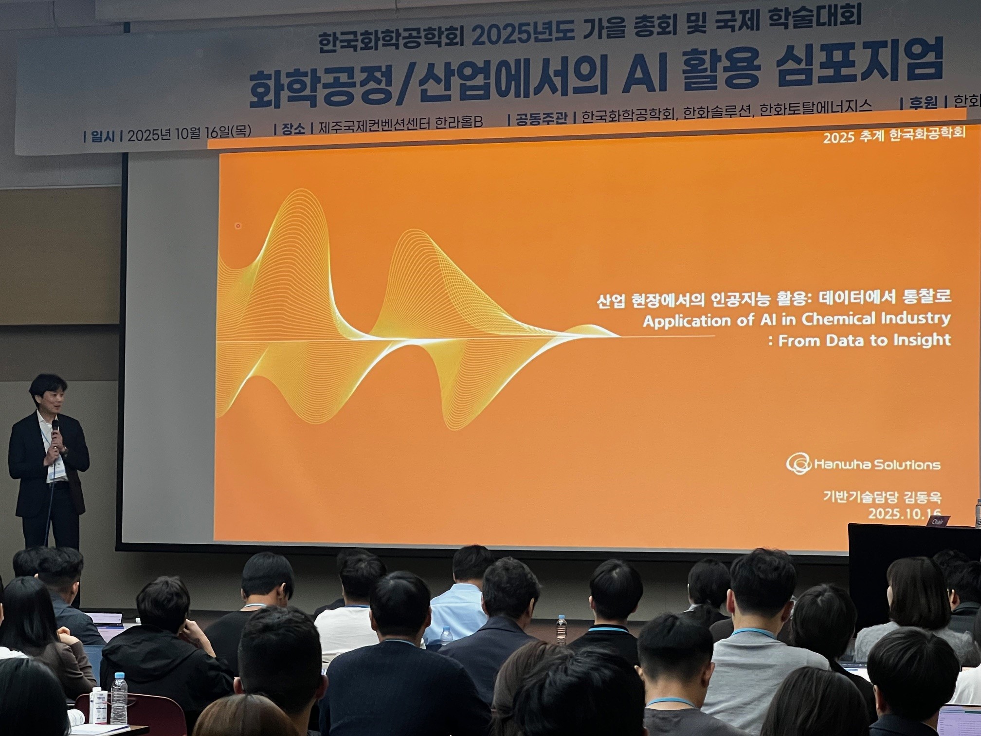 한화솔루션은 지난 10월 16일 제주국제컨벤션센터(ICC)에서 열린 한국화학공학회 추계학술대회에서, ‘화학공정·산업에서의 AI 적용’을 주제로 한 산학연계 심포지엄을 진행 하였습니다.